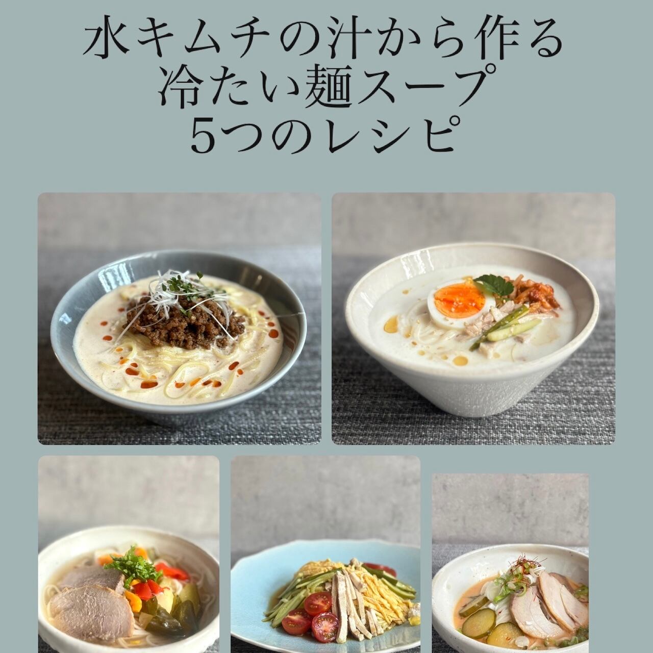 水キムチの汁を使用した、さっぱりとした冷たい麺スープの5種類のレシピをお楽しみいただけます。夏の暑い日にもぴったりな、お手軽かつ健康的な腸活スープが楽しめます!